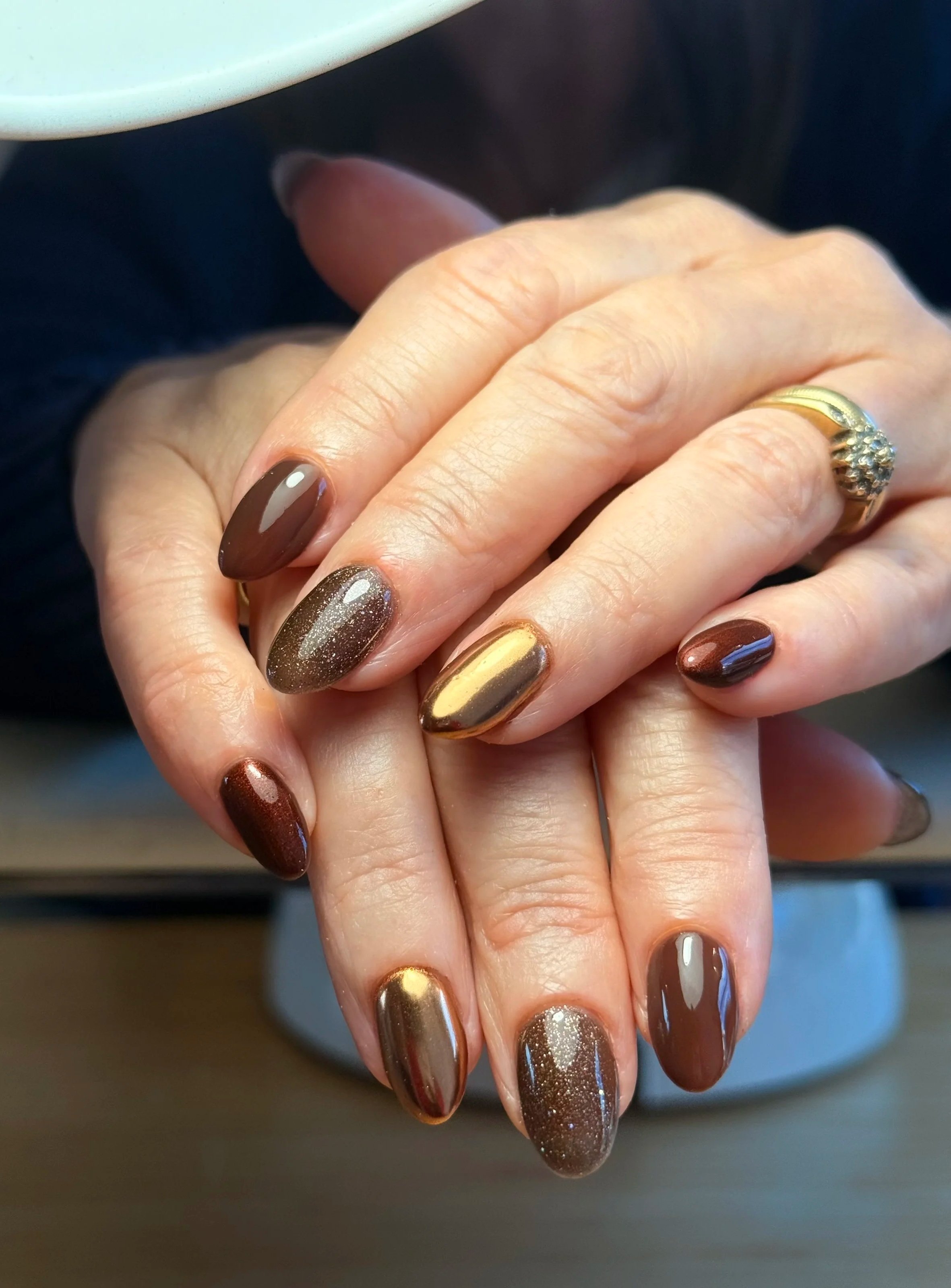 Classic one colour set without or with nail art on one or all nails including foils, flakes, chrome powder and glitters, dots, lines.