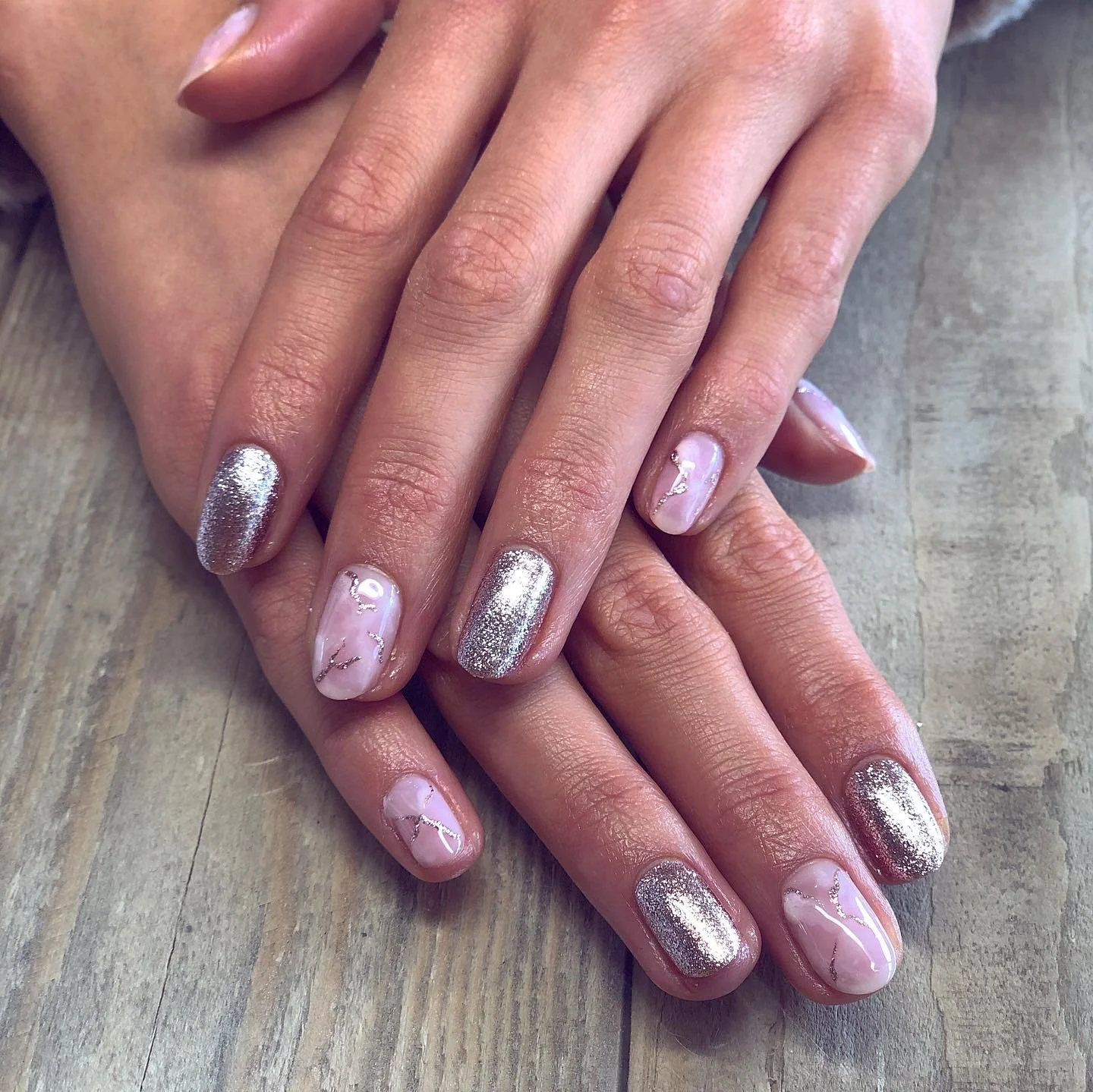 Nail art on one or all nails including foils, flakes, chrome powder and glitters or minimalistic hand painted details e.g. dots, lines.